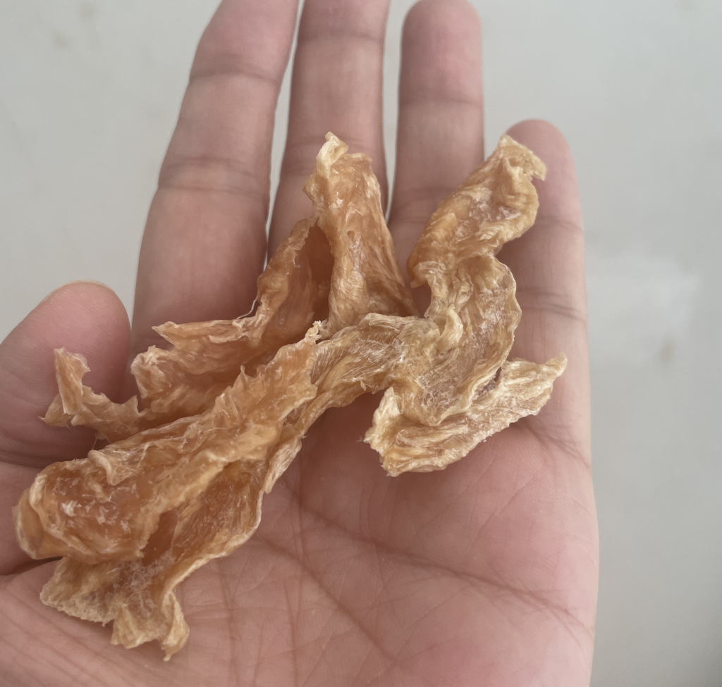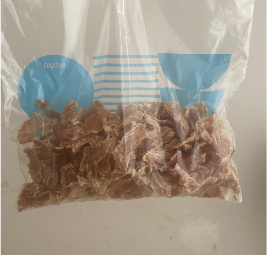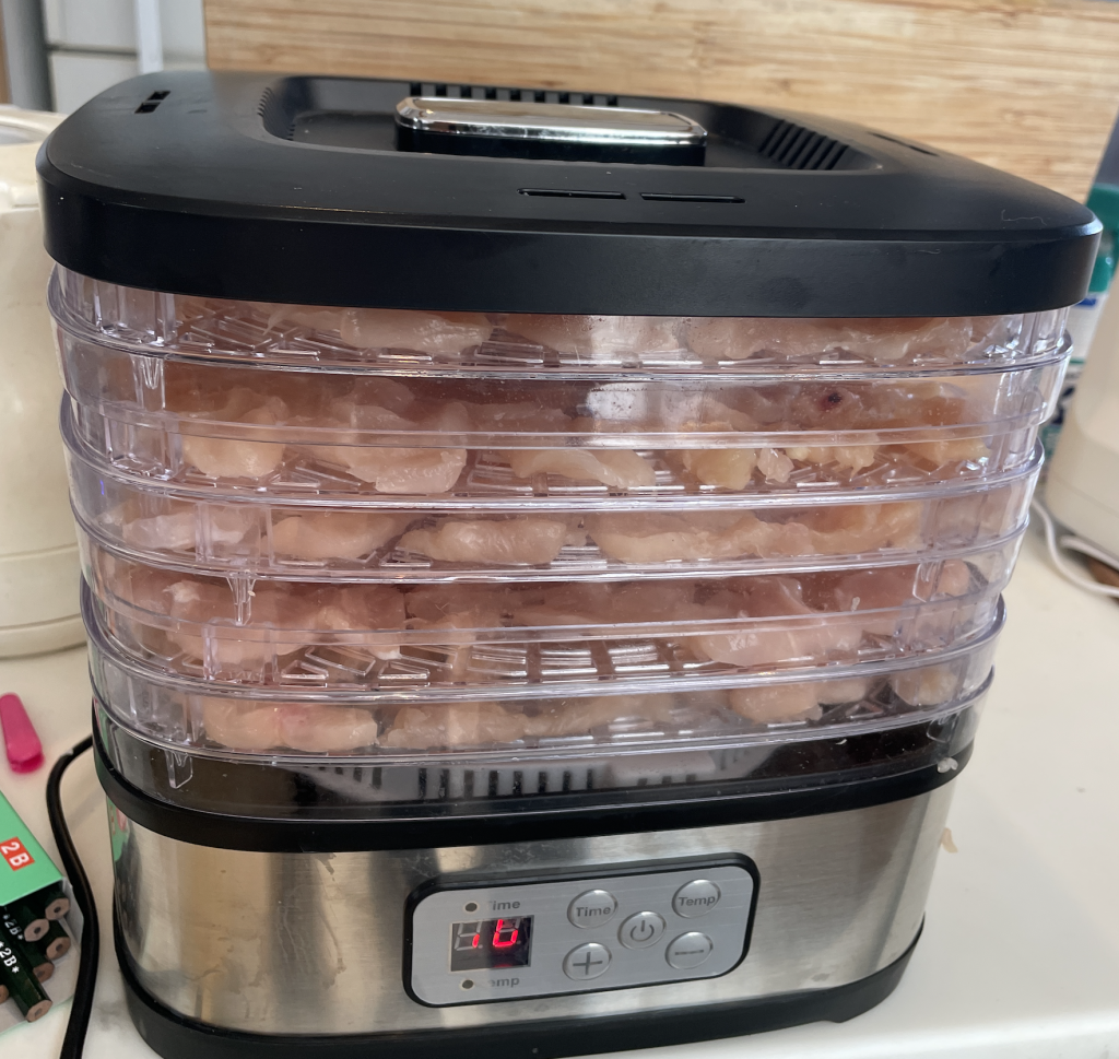 今回は1.3キロ買ったササミ全ては乾燥機に入れられず、1キロくらいジャーキーに回して残りは人間が食べることにしているのですが、完成したジャーキーは大体250gでした。